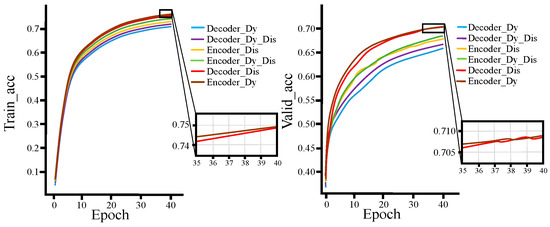 From Figure 15 and Figure 16, for both the training and validation sets, the loss function and accuracy of Decoder_Dis curves and Encoder_Dy curves are optimal and similar, while Decoder_Dy curves show the worst performance. This also demonstrates that using the dynamic fusion mechanism on the encoder end and the knowledge extraction paradigm on the decoder end is an optimal fusion strategy.