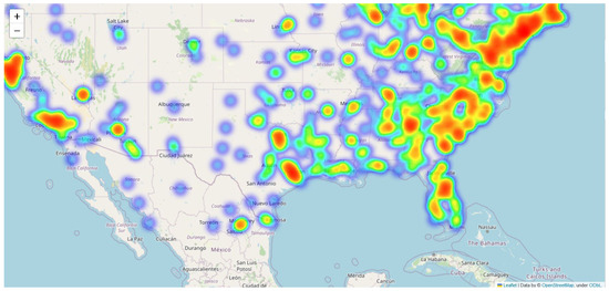 To evaluate our location inference model, we utilized GeoText, the widely used Twitter geolocation dataset. The dataset has been pre-segmented into training, validation, and test sets and has been extensively used for training and evaluating Twitter user location inference models. Each sample consists of four components: the user’s username, longitude, latitude, and tweets. Specific information is shown in Table 1; the distribution of users in GeoText spans the continental United States. Figure 2 depicts a heatmap of the location distribution of GeoText, with darker areas representing a higher density of users.