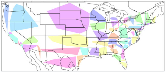 In reality, the majority of user location coordinates are concentrated in urban areas. This paper uses the k-d tree algorithm to discretize the user coordinates to prevent the model prediction results from being substantially biased towards large cities (such as New York City), wherein the hyperparameter bucket_size controls the maximum number of users for each location region. The k-d tree algorithm is then used to assign users in the training set with similar location distances to the same location region, and the central coordinate point of each region is set as the average longitude and latitude coordinates of all users within that region. For each user’s coordinates in the validation and test sets, the centroid of each region is traversed and the formula is used to calculate the distance between the centroid’s coordinates and the user’s coordinates. Then, the users in the training and test sets are designated to the region in which the centroid is closest to them. The area number of the user’s location is used as its label. Figure 3 depicts the result of using k-d tree to classify the user coordinates in the training set in GeoText. Each color block represents a location area.