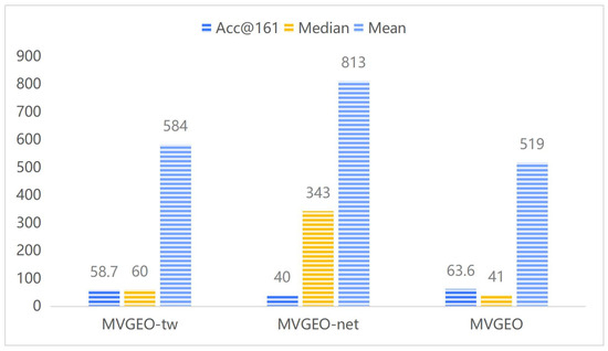 Due to the high cost of data sample annotation and the effect of the collected corpus on location indicator terms and mention relations in tweets, these variables can impact the model’s inferential efficacy. Therefore, to investigate the performance of the model presented in this work in more depth, we conducted experiments using only a small number of samples with annotations on the tweet view. This experiment produced the model variant MVGeo-net, which reduces the labeling cost and removes the effect of mention relations. As demonstrated in Figure 6, by comparison with the text-based model MLP4Geo [8], MVGeo-net’s performance improves on all three evaluation metrics. This shows that the method proposed in this work not only saves resources but also improves our understanding of model performance.
