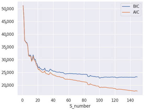 In the network view, the neighbor coordinates of all celebrity users are clustered using a Gaussian mixture model, and the number of Gaussian sub-distributions, S, impacts the model fitting. Akaike Information Criterion (AIC) and Bayesian Information Criterion (BIC) can be used to determine the extent of the influence of the S value on the Gaussian mixture model. By adding a penalty term proportional to the number of model parameters, these two metrics circumvent the overfitting issue and select the value of S by minimizing the AIC and BIC. Figure 7 depicts the effect of the S value on model fitting on the GeoText dataset. Combining the changes to the two indicators, the magnitude of S on the GeoText dataset is estimated to be 125 in this study.