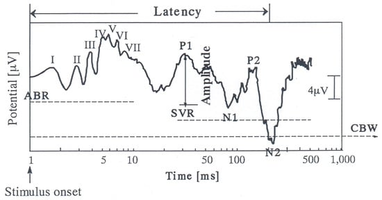 The AEP is a method of gathering the averaging waveform of electroencephalography (EEG) in a section beginning at stimuli onset. The averaging frequency is decided by the magnitude of evoked potential, for example, SVR needs about 50 times average, the ABR needs more than 300 times average for coming to view of I–VII peaks, and the CBW can be recorded through originality.
