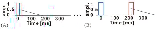 Schematic pictures of the ITDG manipulations of the early part of the impulse responses. (A) panel shows the direct sound to the initial reflection with the reverberation component at an ITDG interval of 22 ms and (B) panel shows the ITDG interval of 220 ms.