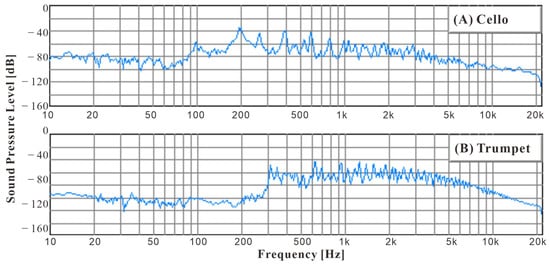Frequency responses of the (A) cello and (B) trumpet pieces.