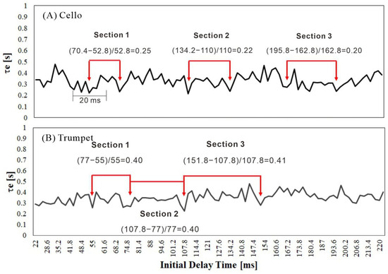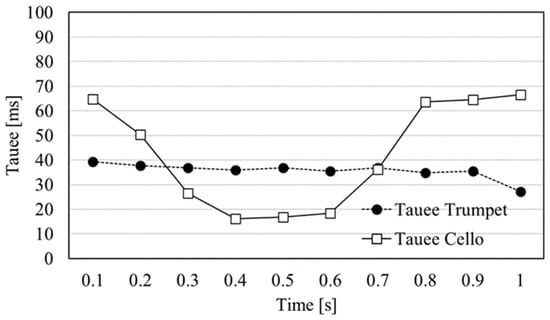 In this study, there were two dry sources that simulated an instrumental solo: a trumpet piece (Prince of Denmark’s March, by Frank Fezishin) and a cello piece (Girolamo Frescobaldi, Toccata, by Arr. Gaspar Cassadó), whereas motifs were set at equal (1—IACCE3) and G values along the way. However, the frequency responses were higher than 300 Hz for the trumpet piece, and fluttered at 200 Hz, 400 Hz, …, and so on for the cello piece (Figure 5). In addition, the running autocorrelation function (ACF) of the two pieces proposed by Ando (Chapter 3 in [17]) were calculated as shown in Figure 6. The average τe values (ms) of two music pieces were 35.90 ms for trumpet and 46.92 ms for cello. However, the minimum τe values of two pieces were 31.25 ms and 16.24 ms, which were calculated as a function of preferred initial delay time of the music signal in a sound field reported by Ando [27]. According to the settings of amplitude of the first reflection (A1) and reverberation part (AR), total amplitude of reflections (A1 + AR) was equal to 1.5 (as the amplitude of direct sound A0 = 1), so the preferred IDTGs of the two instrumental pieces were estimated as 42.2 ms for cello and 32.3 ms for trumpet, respectively. Table 1 lists the total index of the autocorrelation function (ACF) calculated using both music signal sources.
