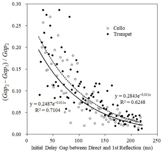 According to Figure 7, the perceived ITDG changes of the 17 subjects were lower for the trumpet piece, as indicated by the lower number of JNDc points compared with the cello piece. This shows that the ΔGap was often greater for the trumpet piece, and there was a greater difference between the subjects’ responses, and it can be known that high-frequency sounds have larger JNDc values. This can be explained by the fact that the stimulus was a musical piece; if white noise was used as a stimulus instead, the difference could be significantly reduced. As shown in Figure 7, the results revealed that the JNDc of the cello piece and the trumpet piece were rated approximately 0.059 and 0.081 at a 50% “different” judgement range in most cases, respectively. Additionally, the JND of ITDG of the cello piece was measured as 7.4 ± 2.75 ms, while that of the trumpet was 10.18 ± 3.52 ms in the continuous variations of sound field structures.