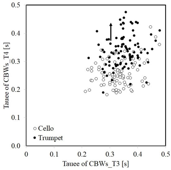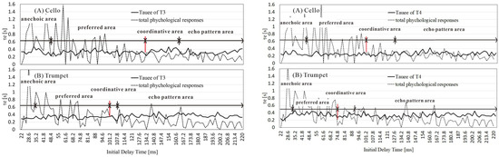 If the W_IACC value of the source in a concert hall is an effective variable of the ITDG, then this explains why the T4 (right hemisphere) responses in brain coordinated at the beginning in front of the T3 (left hemisphere) responses on the varying ITDGs for both instrumental pieces along the way (Figure 10). Fujii et al. [42] proposed that the W_IACC value of the source in a concert hall is dominated in the right hemisphere, which is specialized as a spatial factor in a concert hall.