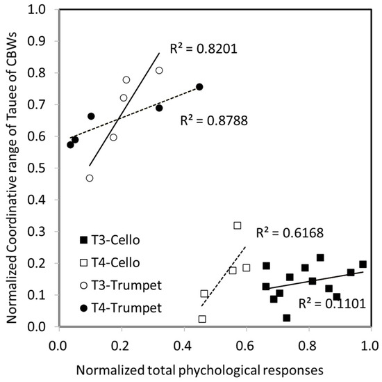The coordinative period between the normalized summation of subjective responses on ITDG and the normalized τe (s) of ACF of CBW in the alpha rhythm range show well correlation in both hemispheres for the trumpet track, but the lower values for the cello in the different part of range of illustration.
