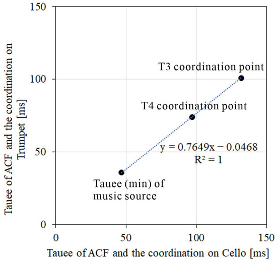 As shown in Figure 12, the τe_min of the ACF of two instrumental source pieces were evidently functioning with the coordinative beginning point between the subjective ITDG’s “different” decision-making process and the τe of the ACF of brainwaves in the alpha range under varying sound field ITDGs in the left and right hemispheres. The coordination period here was indicated by the phenomena shown in Figure 10 and was related to the short-term τe values of the ACF of music signals in a room [28] for a duration of at least 10 ms. These coordinative characteristics were confirmed in both hemispheres, with a constant delay of 31 ms for the cello piece and 23 ms for the trumpet piece. Therefore, the slope (0.76) in Figure 12 denotes the difference between two instrumental timbres for continuous variation of ITDG sensation in a room, and the function between the τe of the ACF of brainwaves in the alpha range with respect to two instruments (cross axle) shows linear correlation with τe_min of the two musical dry sources.