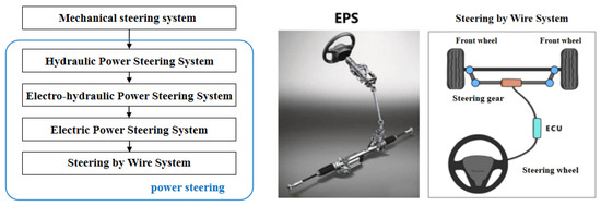 As shown in Figure 1, the automotive steering system has gone through several stages including a mechanical steering system, hydraulic-power-assisted steering (HPS) system, electro-hydraulic-power-assisted steering (EHPS) system, electric-power- assisted steering (EPS) system, and a steer-by-wire (SBW) system [7,8]. The wire- controlled steering system eliminates the mechanical connection between the steering wheel and the steering wheel compared to EPS [9,10,11,12,13,14].