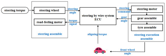 The wire-controlled-steering system is divided into three parts: the steering wheel module, the steering execution module, and central control unit (ECU) [16]. The steering wheel module includes components such as the steering wheel torque, angle sensor, road sensing motor, and its reducer [17]; The steering execution module includes components such as the linear displacement sensor, angle sensor, steering motor, and its deceleration mechanism; In addition, the wire-controlled-steering system also includes components such as a steering controller and power supply [18].