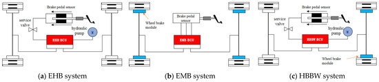 Previously, the brake-by-wire system was mainly divided into three types: the first was the Electronic Hydraulic Brake (EHB) system, the second was the Electronic Mechanical Brake (EMB) system, and the third was the Hybrid Brake-by-Wire (HBBW) system [36,37].