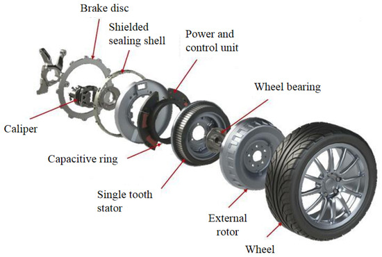 Hub motors are mainly divided into two types: outer rotor motors and inner rotor motors, with differences mainly reflected in the presence or absence of a reduction structure. The inner rotor hub motor and wheel edge motor converge in transmission structure, with the main difference being that the inner rotor motor is integrated with the hub, while the wheel edge motor is placed on the wheel edge [69]. The schematic diagram of the hub motor drive device is shown in Figure 4. Overall, the application of wheel hub motors has the advantages of high integration, flexible driving, and being in line with the development of intelligent vehicles and platform generalization applications [70].