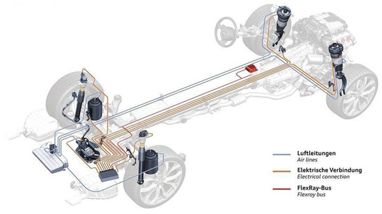 According to the actuator, from the perspective of technological maturity and equipment rate, air springs and CDC-type wire-controlled shock absorbers are the most common. The MRC shock absorber has good shock absorption effect and fast response speed [77,78]. There will be good development space after the price drops in the later stage. Due to its strong substitutability, the necessity of equipping the wire-controlled anti-roll bar is relatively low. Figure 5 illustrates the basic structure of an air suspension system.