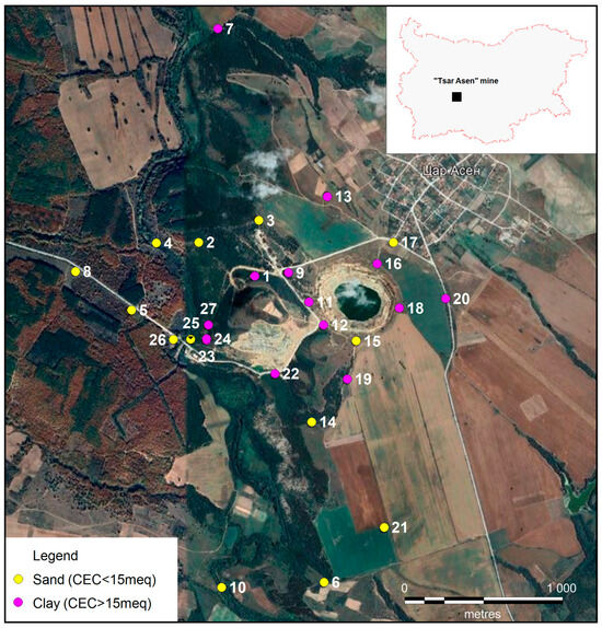 The “Tsar Asen” mine is located near the town of Pazardzhik, in an area known for its copper deposits. This mine is part of the Radka ore field, together with the Radka and Chervena Mogila ore deposits. The spatial position of copper porphyry ores that have been established in the “Tsar Asen” deposit is controlled by Late Cretaceous hypoabyssal to subvolcanic-hypoabyssal porphyry intrusives or dyke bundles. According to its characteristics, in the copper porphyry deposits in the “Tsar Asen” region, apart from the apical parts of the minor porphyry intrusives, the mineralization is localized to a large extent in the surrounding effusive rocks and volcanic necks [21]. The operation of the mine began in 1979, and for 20 years, copper ore has been mined by the open pit method. Despite the real danger of contamination of the area around the mine, no data on the determination of PTEs can be found in the literature.