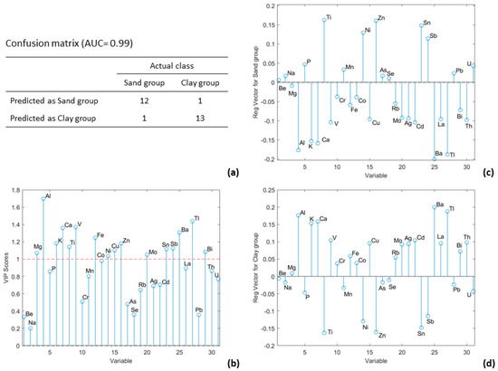 The PLS-DA modeling results for the sand and clay groups were based on the element concentrations of the samples: (a) confusion matrix; (b) VIP scores; (c) regression vector for the sand group; (d) regression vector for the clay group.