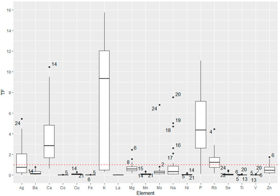 The calculated TFs in the soil–plant system are presented graphically, and the analyzed elements were divided into two groups. The first group contains macro- and microelements, most of which have an essential function for the plant (Figure 3), and the second group contains potentially toxic elements (Figure 4).