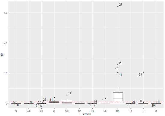 As mentioned, the TFs indicate the passage of the given chemical element from the soil to the plant. Significant TFs are considered those greater than 1. TFs higher than one are considered normal for essential elements since they are at the core of all life cycles in a plant. As evident from Figure 4, the TFs of potentially toxic elements such as Sn and Cd were higher than 1, which should be considered in the risk assessment.