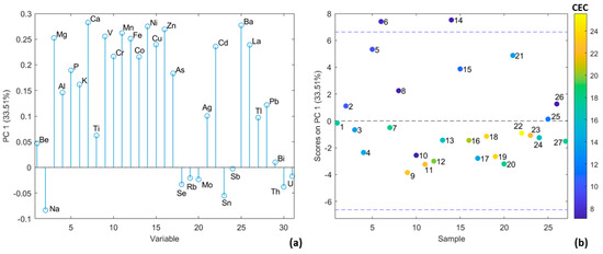 PC1 factor loadings (a) and factor scores (b) of the element accumulation factor dataset.