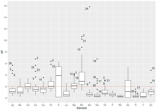 The calculated AFs outlined five elements with a median above 2: Ca, K, Fe, Mg, and Mn. All of these elements had higher AFs at the sampling location from the sand group (Figure 8). The result obtained for P is interesting, as it appeared to have a low AF while a high TF was observed. This can be explained by the fact that the high concentration of phosphorus in the dandelion is not due to its ability to accumulate this element, but to the higher concentration of this chemical element in the adjacent soil. Potentially toxic elements with significant AFs were Cd and Sb. These accumulated in the dandelion at predominantly sandy locations with low pH (Figure S2).