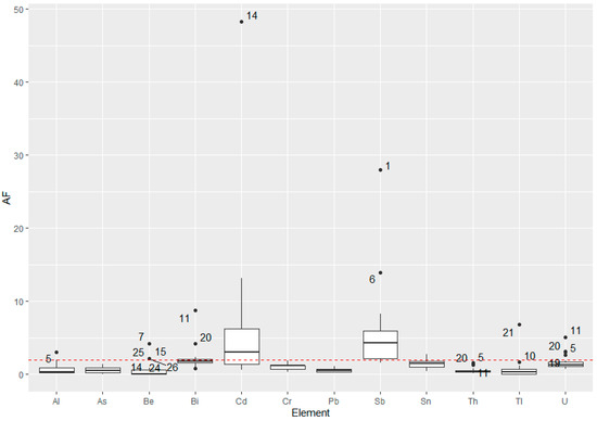 The AF is an important indicator because it gives an idea of the dandelion’s response to environmental pollutants. The different accumulation coefficients in polluted areas versus the background indicate that the elemental composition of the plant changes in response to the anthropogenic pollutant. Significant accumulation factors are those greater than 2 [54]. The results showed that AF > 2 was observed for both essential elements and the potentially toxic Cd and Sb.