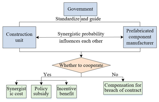 29] theory to study the impact of government policy support on supply chain synergy benefits. For the sake of model simplicity and clarity, according to the status and function of each subject in the supply chain, and taking into account the specificity of the assembly building, prefabricated component manufacturers are included in the game system. Therefore, the participating subjects in the supply chain of prefabricated building projects are simplified to the government, construction units, and prefabricated component manufacturers, and under different scenarios, the benefits–cost-sharing contract is introduced to coordinate the supply chain [