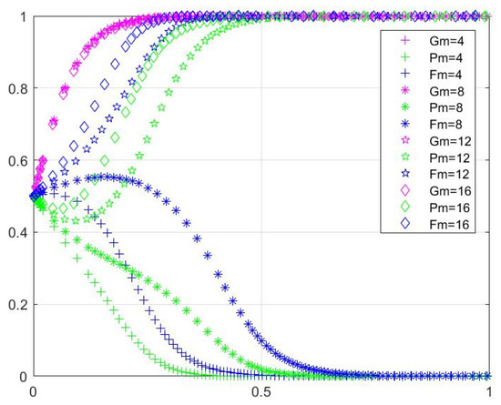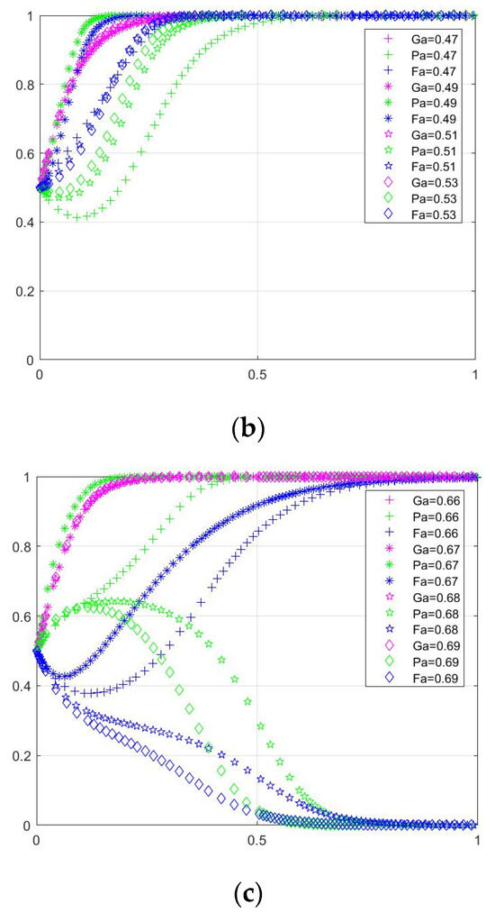 Figure 7 shows the three sets of data screened out after many evolutionary simulations, and it can be observed that the thresholds of the initial participation probabilities of the three parties are all in the range of 0.45 to 0.48. It can be discussed in three cases: