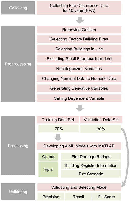 The remainder of this paper is organized as follows. Section 2 presents the trend of previous ML research related to fire to set the direction of ML development. Section 3 presents the material and methods (preprocessing of learning data and developing ML models). Section 4 presents results and conclusions derived from the development of a fire data-based property damage rating classification model. Finally, Section 5 presents the conclusions.
