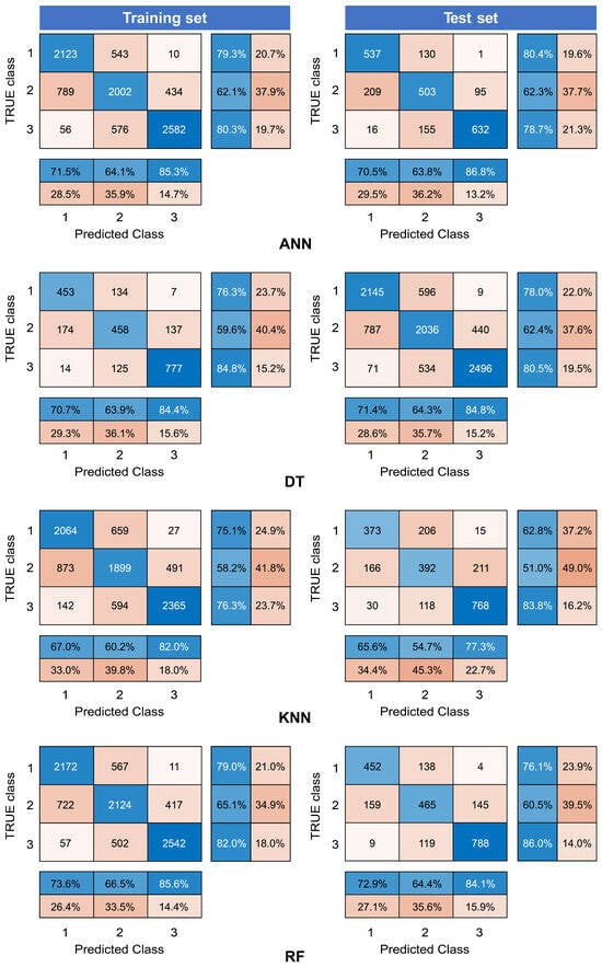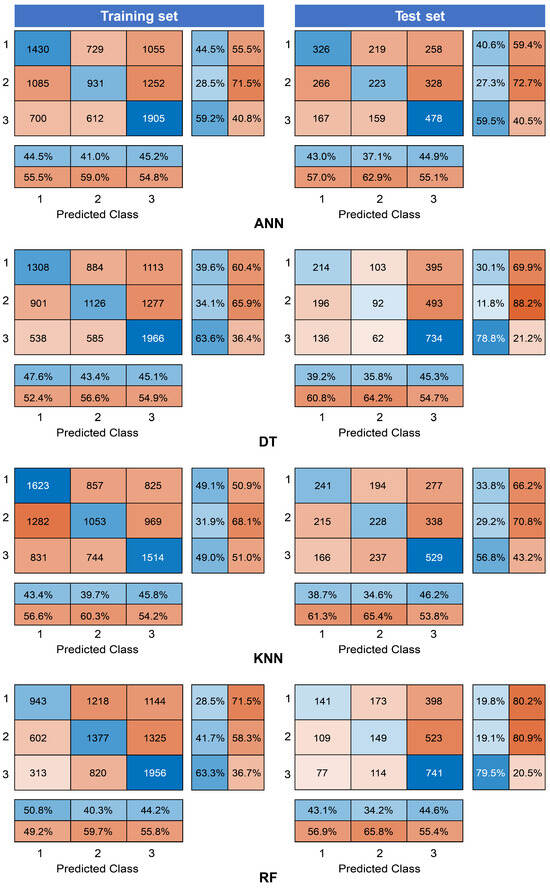 Finally, the actual applicability of the ML models was examined by analyzing the confusion matrix results for the validation data.