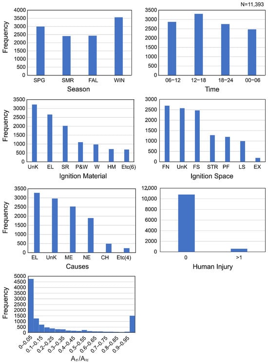 Among the fire scenario input variables shown in Table 8, except for the season of fire and time of fire, the ignition factor, ignition material, ignition point, human casualties, and burnt area/TFA were found to significantly affect the output variable. It was shown that the season of fire probabilistically had no significant influence compared to other variables because fire evenly occurred regardless of the season.