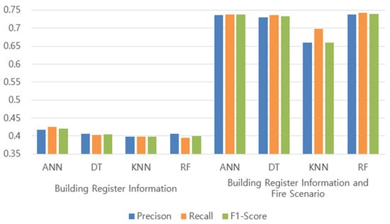 The entire dataset was divided into training and test sets. The training set was used to set a prediction model, and the model’s performance was evaluated through the test set. In this study, four ML models, ANN, KNN, DT, and RF, were evaluated. The performance of the models was evaluated using precision, recall, and F1-score. First, learning (a total of 12,223 data items) was performed using only building register information, and then learning (a total of 11,393 data items) was performed by adding fire scenario information to the building register information to examine the difference.