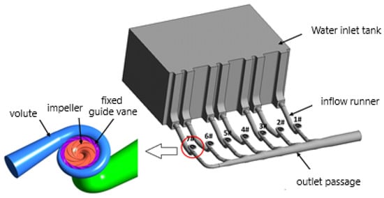 The research object is a pump station with six water pump units and one standby water pump unit. The water flow is introduced from the inlet channel to the water pump unit, passing through the impeller, fixed guide vanes, and volute, and finally leads to the outlet water tank via the outlet channel. The design flow rate of a single pump is 12.6 m3/s, the design head is 108.5 m, the maximum head is 116.5 m, and the minimum head is 100.9 m. There are two types of elbow shaped inlet channels; one has the central axis 4.7° to the left (units 1, 3, 5, and 7) and the other has the central axis 12.4° to the right (units 2, 4, and 6). The installation elevation of the pump unit is 421.00 m, the rated speed is 375 r/min, the maximum shaft power is 16 MW, the inlet diameter of the impeller is 1.397 m, the outlet diameter is 2.408 m, and there are 7 blades and 13 fixed guide vanes. The geometric model of the pump station is shown in Figure 1.