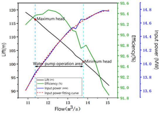 In the above equations, —total input power of the pump station, in MW; —number of units started; —input power of the ith operating unit, in MW; —total water intake of the pump station, m3/s; —working flow rate of the ith operating unit, m3/s; —minimum head of the water pump unit during operation, m; —maximum head of the water pump unit during operation, m; and —working head of the ith operating unit, m.