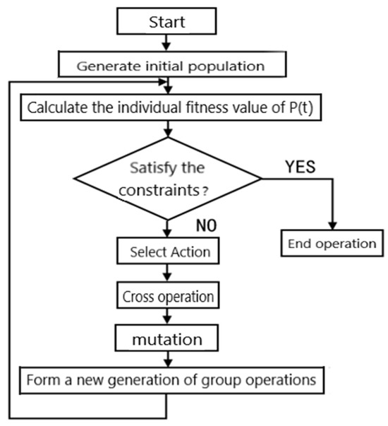 This study mainly considers two aspects for optimizing the flow distribution within the pump station. First, under the premise of ensuring the operation task of the pump station, the fixed total water intake of the pump station is reasonably distributed among the operating units. By providing an objective function and corresponding constraints, a mathematical model is established to scientifically and reasonably allocate the water flow, and the optimal combination of flow distribution under different water intake quantities is obtained. The energy consumption or input power within the pump station can then be minimized. The second aspect is the optimization combination between units within the station. Under the premise of scientific flow allocation, with the determined optimal pump station combination plan, different unit combinations are used to optimize the advantages of each operating unit while minimizing energy consumption for the whole system, thereby maximizing the pump station benefits. Thus, this study selects a genetic-algorithm-based optimization method for unit flow distribution in pump stations. The basic process is shown in Figure 3.