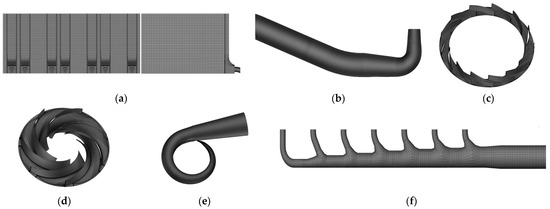 Schematic diagram of meshing of different components: (a) water inlet tank; (b) inflow runner; (c) fixed guide vane; (d) impeller; (e) volute; (f) outlet passage.