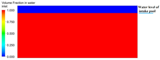 The total water intake of the pumping station varies and the corresponding water level of the inlet pool also varies. The water level of the inlet pool corresponding to different water intake volumes is shown in Table 3. The boundary conditions are (1) at the inlet of the inlet pool, given the liquid level height and static water pressure of the inlet pool; (2) the outlet boundary is the extended section of the volute and the boundary condition is set as the mass flow outlet. The inlet boundary conditions are shown in Figure 7. The red area in Figure 7 represents the liquid domain, the blue area represents the gas domain, and the boundary between the red and blue areas represents the liquid level.