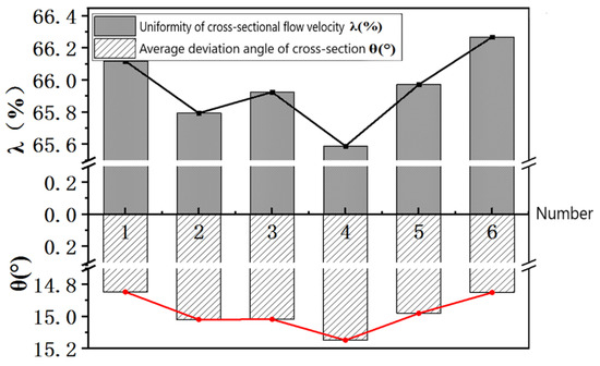 Figure 8 shows that, under different schemes, the flow velocity uniformity and average deviation angle at the inlet section of the water pump have no significant variation amplitudes. In the full combination scheme, the maximum average deviation angle of the water pump inlet section is 15.15° and the minimum is 14.84°, with a difference of 0.31°, while the maximum value of flow velocity uniformity is 66.28% and the minimum is 65.59%, with a difference of 0.69%. Thus, the changes are not significant. Considering the uniformity of flow velocity and average deviation angle at the inlet section of the water pump, the results show that when the total water intake of the pump station is 70 m3/s, the sixth group of combination schemes is selected; that is, the operating unit of the pump station and its corresponding working flows are 12.5 m3/s for Unit 1 and 11.5 m3/s for Units 2–6. This scenario achieves the minimum input power of the pump station and the maximum overall efficiency.