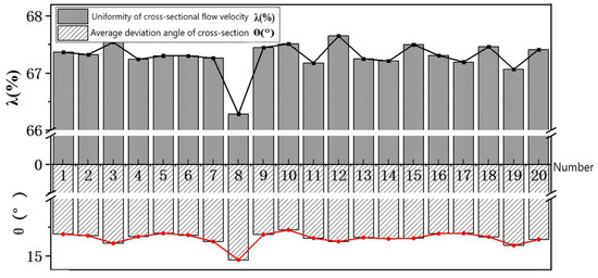 Figure 9 shows the calculation of the full combination scheme when the total water intake of the pump station is 60 m3/s. From the total diversion volume of the pump station at 70 m3/s, the difference between the maximum and minimum flow velocity uniformity values of the inflow index section decreases to 0.37%, while that between the maximum average deviation angle values of the index section increases to 0.52°. However, overall, these changes are not significant. Based on a comprehensive comparative analysis, the combination scheme of the 12th group is ultimately selected. The corresponding working flow rates for the operating units of the selected scheme are 11.5 m3/s for Units 1, 5, and 7; 13.5 m3/s for Unit 3; and 12 m3/s for Unit 4.