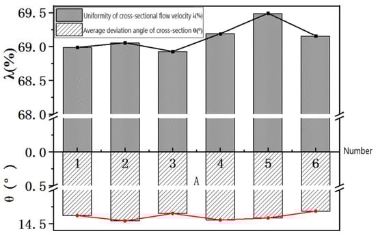 When the water intake of the pump station is 70 m3/s and the working head of each operating unit is ensured to be within the head constraint conditions, six units are started, of which five have a flow rate of 11.5 m3/s. The total input power of the pump station is at minimum when the other unit has a flow rate of 12.5 m3/s. The corresponding working flow of each operating unit of the pump station, combined with the results of flow distribution, is determined by adopting a full combination scheme. Six flow distribution combination schemes are evaluated and shown in Table 4, with the uniformity of flow velocity at the inlet section of the pump and the average deviation angle of the section as indicators (such as in Equations (4) and (5)). Compared with other cases, when the axial flow velocity uniformity and the average deviation angle of the section are closer to 0°, more water flow can enter the pump unit vertically, which is conducive to the safe and stable operation of the pump unit. Figure 8 shows the calculation results of the full combination scheme when the total water intake of the pump station is 70 m3/s.