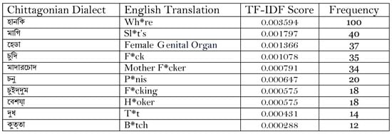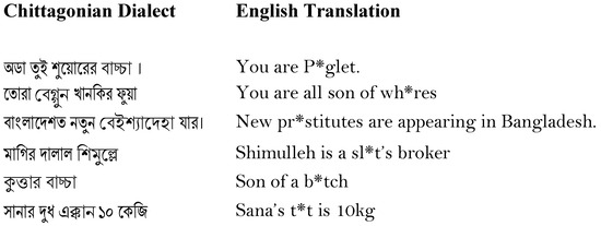 - Mahmud, T.; Ptaszynski, M.; Masui, F. Vulgar Remarks Detection in Chittagonian Dialect of Bangla. arXiv 2023, arXiv:2308.15448. [Google Scholar]