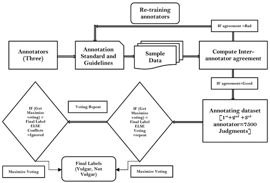 To identify vulgarities, a dataset required annotations adhering to a predefined set of guidelines [47,48]. Therefore, prior to beginning the annotation process, clear and detailed annotation guidelines were developed. Using these guidelines, human annotators were taught how to identify and label vulgar remarks in the text. We provided definitions and usage examples of vulgar words and procedures for dealing with ambiguous cases of vulgar expressions in the guidelines.