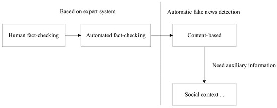 In summary, the fake news detection technology has evolved from expert systems to automatic detection, as shown in Figure 2. For the automatic detection technology, the above literature indicates that the news content alone may be not enough and requires additional auxiliary information, such as social context, for fake news detection.