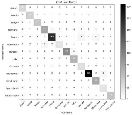 The confusion matrix for our image classification model is shown in Figure 8. Scene classification using images is better than scene classification using audio. The figure shows that, first, there were much fewer test samples that were incorrectly classified, and in some scenes (like beach, forest, harbor, residential, and train station), there were very few misclassified samples. Second, the scenes farmland, orchard, and shrubland were where the misclassified test samples were most-frequently found. In the scene, eight samples of farmland were incorrectly classified as grassland, nine samples of orchard were incorrectly classified as forest, and eight samples of shrubland were incorrectly classified as forest. Eight samples from sports land were incorrectly classified as residential for the same issue, and six samples from lake were incorrectly classified as harbor.