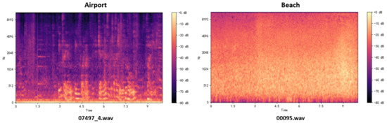 For example, contrast the spectrograms of the 07497_4.wav airport scene and the 00095.wav beach scene. Intermittent high-frequency, high-intensity sounds can be seen in the high-frequency portion of the airport scene spectrogram (the darkest part at the top); medium-to-high-intensity sounds can be seen in the middle portion (the dark, large area in the middle of the spectrogram); there is obviously medium–low intensity sound in the middle and rear portions of the low-frequency portion (the orange–white part at the bottom). By manually listening to the 07497_4.wav file, we can clearly hear the airport broadcast beginning at the third second in the scene (corresponding to the orange part starting at the third second in the spectrogram), as well as the noisy human conversation in the scene (corresponding to the darker, high-intensity portion of the spectrogram). An obvious low-intensity (large areas of orange–yellow) sound in the middle and low frequencies (low-intensity sounds are mainly shown in the middle and lower parts of the spectrogram) can be seen in the spectrogram of the beach scene. By manually listening to the 00095.wav file, we can identify the long-lasting, low-intensity ocean waves that are audible in this scene. Additionally, the spectrogram makes it easy to see the audio noise (possibly wind sound) and the brief burst of bird calls in the first few seconds.