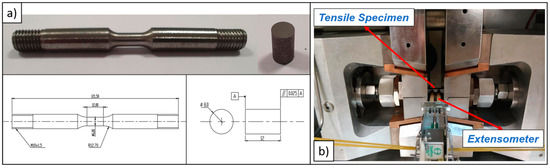Mechanical tests were conducted in uni-axial tension and compression conditions at 0.001, 0.1, 10 (s−1) strain rates through a Gleeble-3500 thermo-mechanical simulator machine. For that purpose, cylindrical specimens (ϕ8*12 mm) were manufactured for the compression tests; meanwhile, dog-bone cylindrical specimens having an initial gauge length of 12 mm were used in tensile testing. The specimens were manufactured while having a good surface finish quality, especially the compression test specimens processed through grinding operations to assure the necessary parallelism between the frontal faces. The technical drawings and real pictures of the specimens are shown in Figure 2. Furthermore, aiming to increase the precision in the strain measurement, a tactile extensometer was implemented for tensile tests at 0.001 and 0.1 (s−1) strain rates. Apart from those tests, the strain values were computed on the basis of conventional cross-head displacement data. A test set-up image with the extensometer installation is shown in Figure 2. All mechanical tests were performed 3 times to ensure the consistency of results. The whole data of mechanical tests were submitted at Section 4.1.