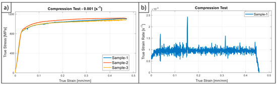 (a) Test results for uni-axial compression test at 0.001 (s−1); (b) true strain vs. true strain rate data for Sample-1 at 0.001 (s−1).