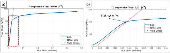 Afterwards, a specific code was created in the MATLAB® environment to compute the yield stresses for the whole tests. To achieve this, the conventional offset stress () method was used. Sample data regarding this computation method were illustrated, and the computed yield stress value is provided in Figure 4.