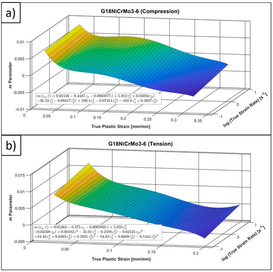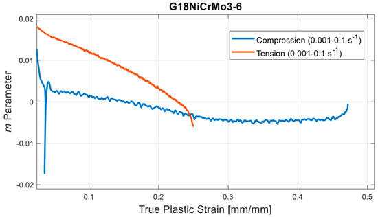 As can be observed in Equation (2), m is not constant, and it is generally a function of the plastic strain and strain rate. However, it is still possible to obtain it with proper data processing operations. This task is also fulfilled by a specific MatLab® code. Since the experimental data were obtained with high frequency (may reach up to 105 Hz), a linear interpolation approach was accepted as a proper solution. While using the above-mentioned formulation and the procedure, m was determined regarding tension and compression asymmetry, as in Figure 5. The built-in function interp1 of MatLab® and the above-mentioned formulation were used, for that purpose (in order to capture the asymmetry of SRS in tension and compression zones, m was computed separately for the designated stress states specifically). The obtained m parameter data were depicted as an advanced version (surface data) at Section 4 since they create a 3D surface through having two independent variables).