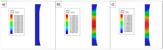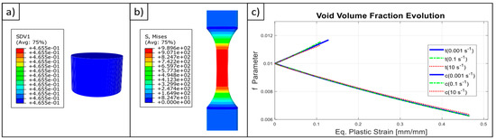 (a) Eq. plastic strain value at the end of FEA analysis (0.001 s−1); (b) eq. stress value at the end of FEA analysis (10 s−1); (c) the evolution of void volume fraction regarding to FEA analysis.