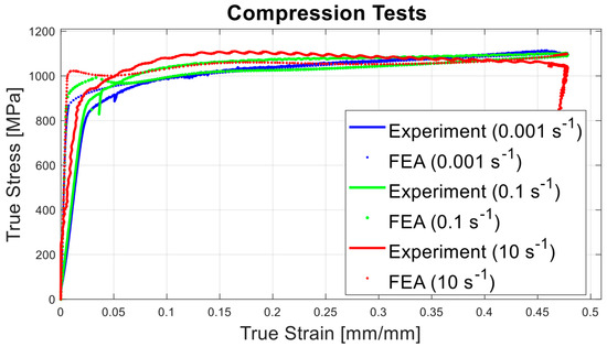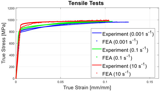 In Equation (1), is the strain rate which is apart from the reference strain rate . Within the scope of this contribution, was taken as 0.001 (s−1), in the same way as the general rule-of-thumb of plasticity, which is based on the fact that beyond this limit materials do mostly not possess any rate dependency. Furthermore, in Equation (2), and are experimentally obtained true stress values which correspond to the same strain value at the strain rates of and , respectively.
